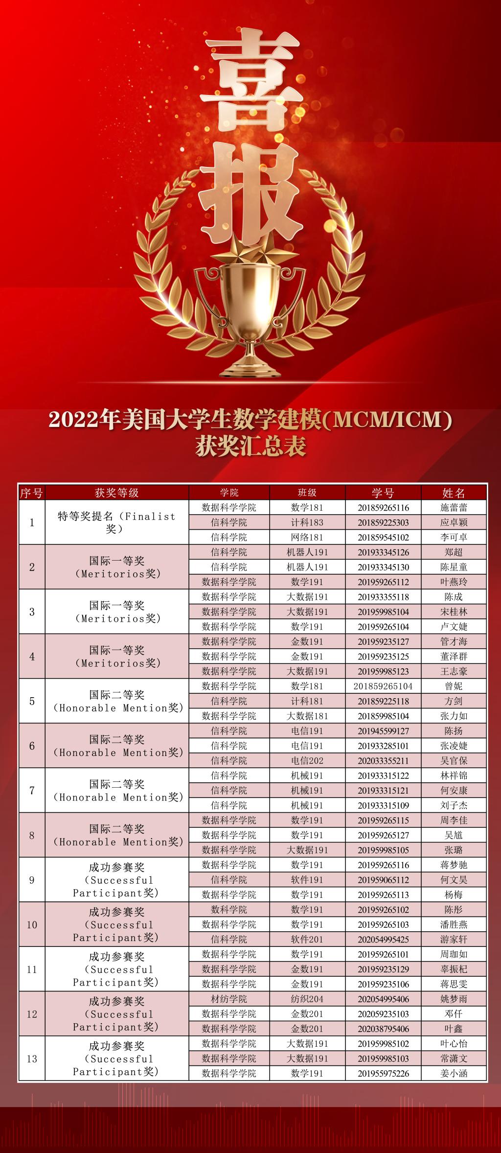 日前,2022年美国大学生数学建模竞赛获奖名单公布,我院学生再创佳绩,获特等奖提名(Finalist)1项、一等奖(Meritorious Winner)3项、二等奖(Honorable Mention)4项。