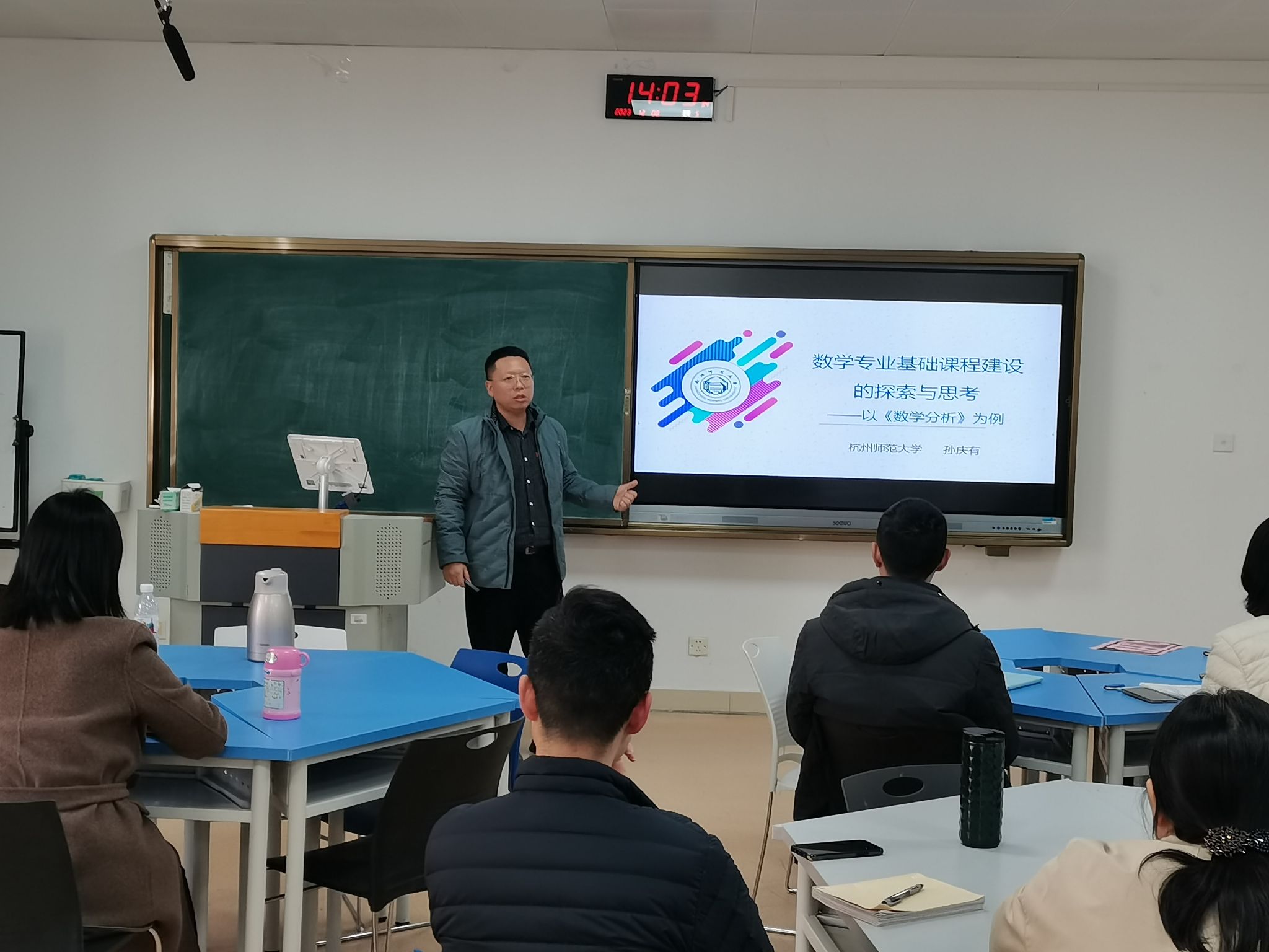课程是学校育人的基础,是立德树人的“主战场”。数学专业基础课程的建设对数学专业人才培养起着重要作用。2023年12月8日下午,杭州师范大学数学学院院长助理、校青年博士联合会副理事长,“杭州市优秀教师”、杭州师范大学“教坛新秀”孙庆有副教授应邀来我校做数学专业基础课程建设报告。学院相关教师参加了报告会,会议由学院院长张景军教授主持。
