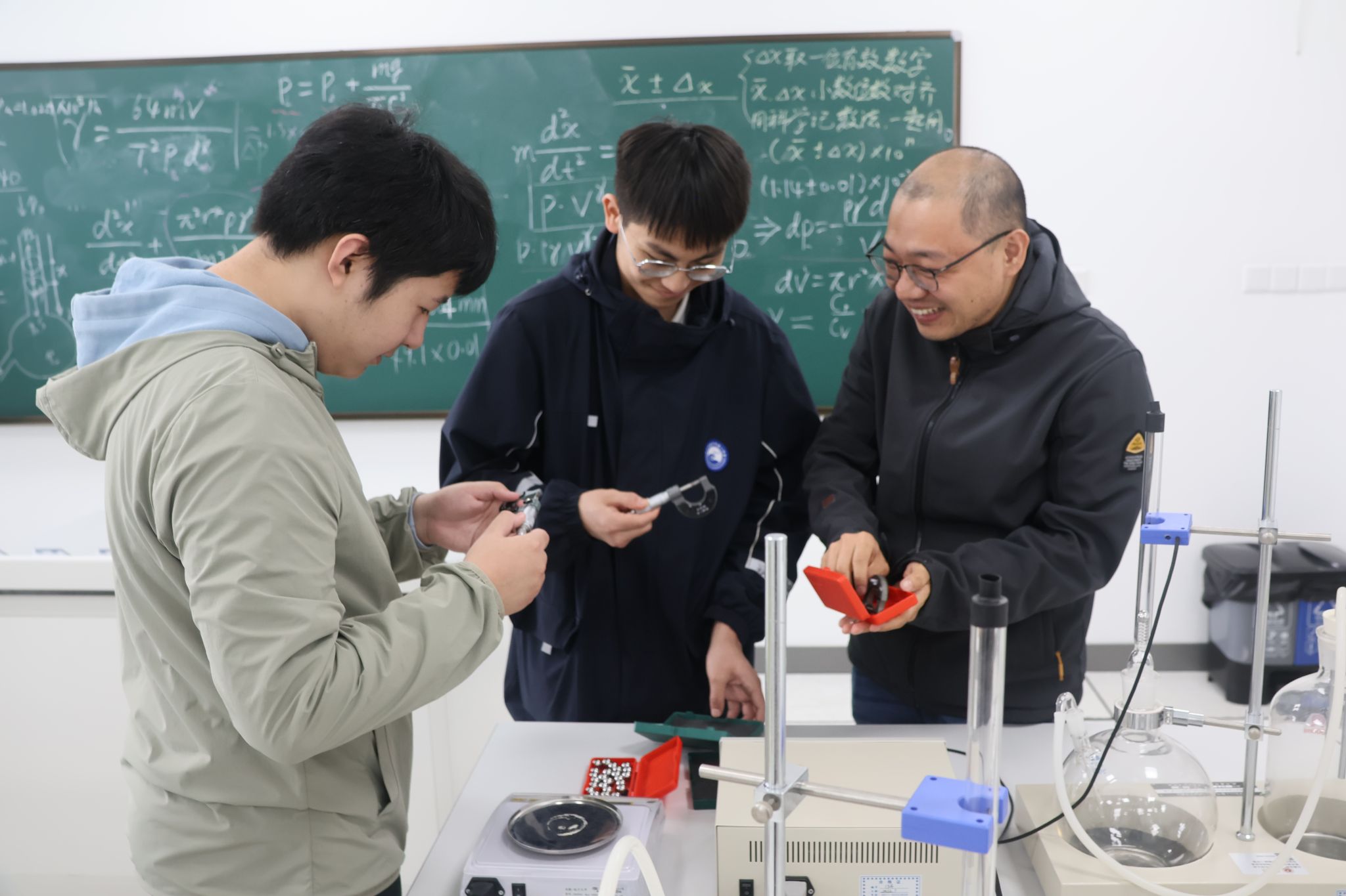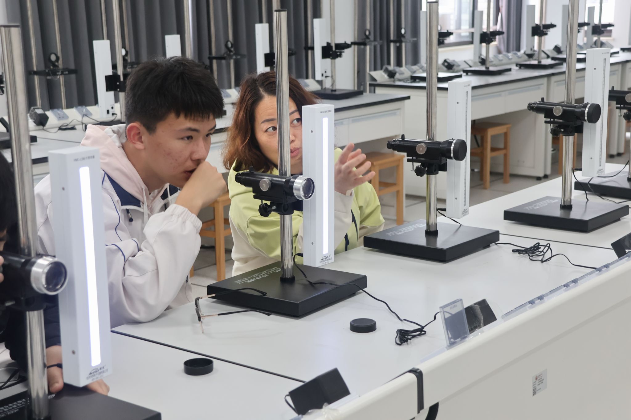 学生进入实验室后,物理导师们介绍和演示了拉伸法测弹性模量、气体比热容比的测量、扭摆法测转动惯量、霍尔效应等实验的原理和操作流程,拓宽学生中学物理知识,过程中解答学生提出的诸多物理问题。