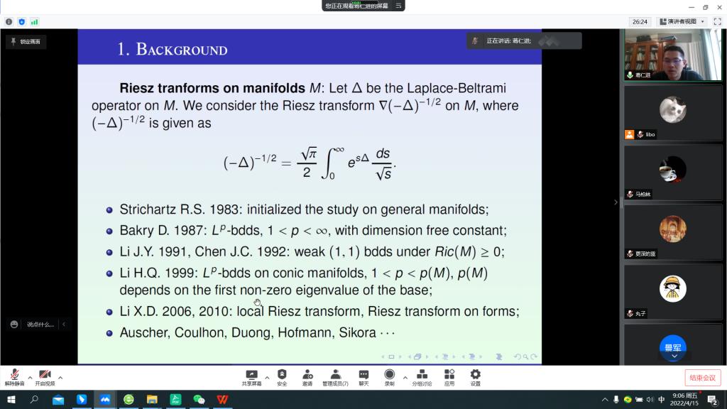 2022年4月15日,应а√中文在线资源库邀请,天津大学蒋仁进教授教授(博导)应邀来我院进行学术交流(线上)。蒋教授主要研究调和分析与几何函数论,已在Comm. Pure Appl. Math.、J. Math. Pure Appl.、Adv.Math.、Math. Ann.等在内的著名杂志上发表论文三十余篇。曾获国家优秀青年科学基金项目、国家自然科学基金面上项目和青年项目资助、欧盟居里学者基金资助,并入选天津市创新人才中青年科技领军人才计划。讲座由а√中文在线资源库教师马柏林教授主持,学院部分老师、本科生和研究生参加了讲座。
