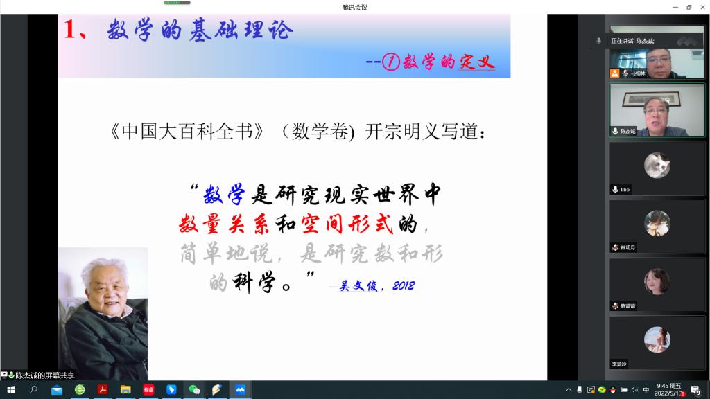 2022年5月13日,应а√中文在线资源库邀请,浙江师范大学陈杰诚教授教授(博导)应邀来我院进行学术交流(线上)。陈教授系浙江师范大学数学与计算机科学学院院长,兼任教育部数学教指委成员、浙江省学位委员会理学一组召集人、浙江省高校数学教指委主任委员;曾任第六—七届国务院学位委员会数学学科组成员、中国科协委员、中国数学会常务理事、浙江省科协常委、浙大数学系主任等,曾获中国青年科技奖、做出突出贡献的中国博士学位获得者,入选国家百千万人才等。1993年开始享受国务院政府特殊津贴。陈教授主要研究调和分析论,已在 J. Funct. Anal.、Sci. China Math.、Pacific J. Math.、Math. Nachr.等在内的著名杂志上发表论文近200篇。