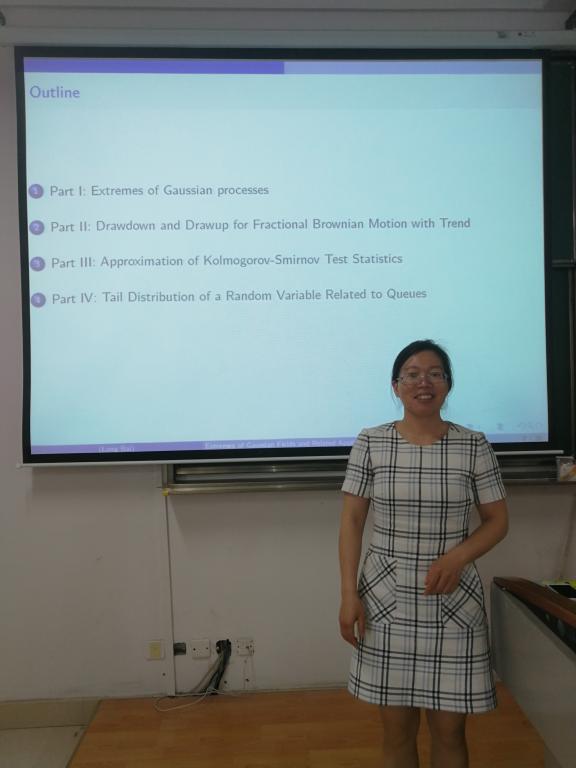 白龙博士以“Extremes of Gaussian Fields and Related Applications”为主题进行交流,介绍了高斯过程与高斯随机之极值的相关研究进展,并重点探讨了一类高斯随机场的尾渐近性及其在风险理论和排队论中的应用。