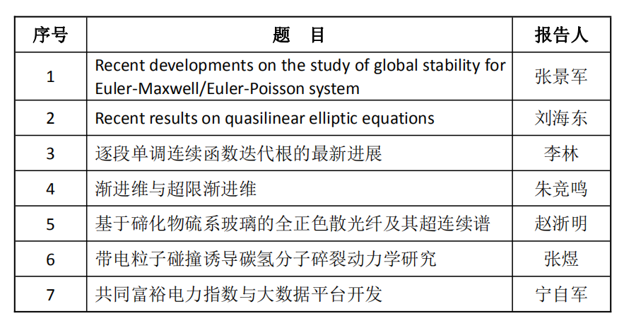 研讨会上共有7位学者做了学术报告,主题如下(表)。报告结束后,与会老师结合报告主题和自身研究领域进行了深入的交流和研讨。