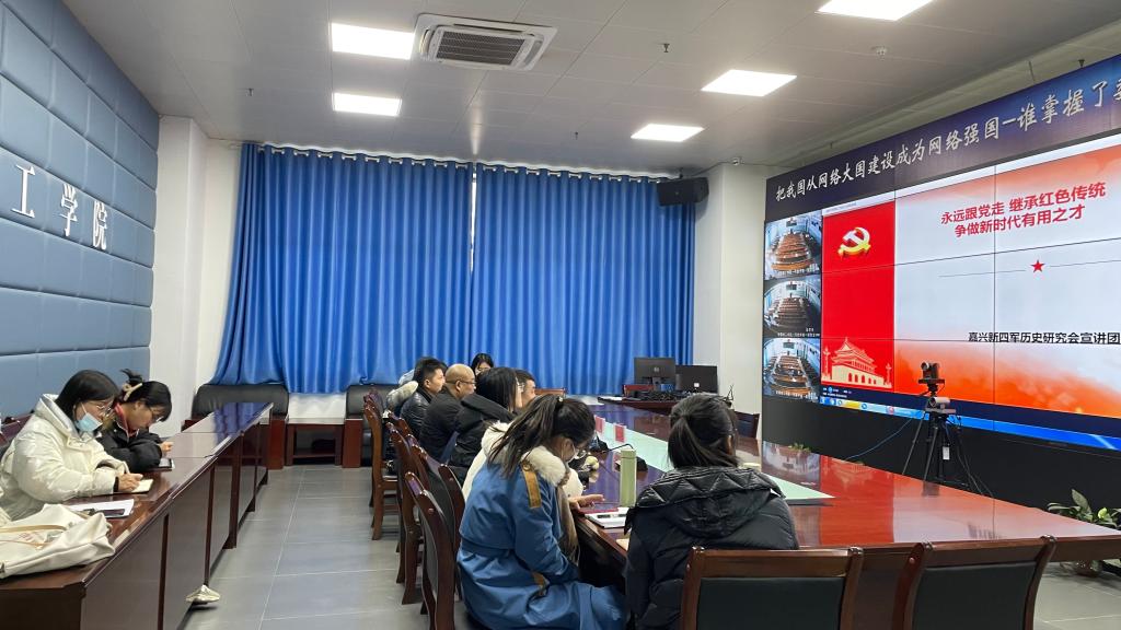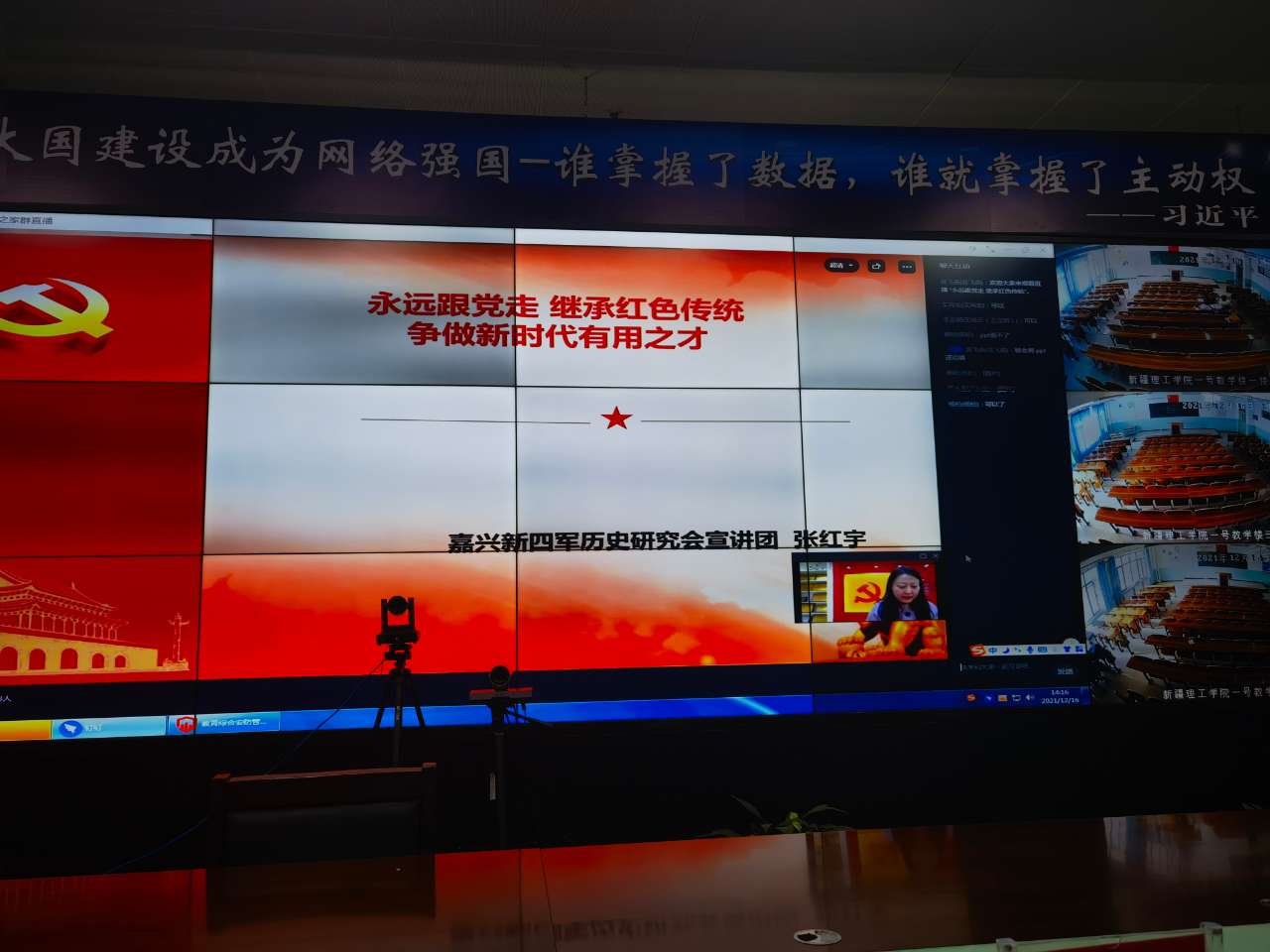 12月16日下午,嘉兴新四军历史研究会宣讲团副团长张红宇老师应邀在博学楼党员之家以线上形式讲授“四史”学习教育专题党课。а√中文在线资源库全体党员、入党积极分子及援疆干部所在的新疆理工学院理学院全体党员共300余人齐聚“云端”参会。嘉兴新四军历史研究会常务副会长、校党委原副书记唐瑞娥,嘉兴新四军历史研究会宣讲团邹政老师参与交流和指导。