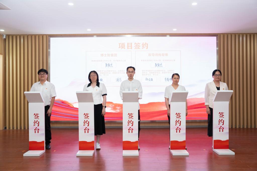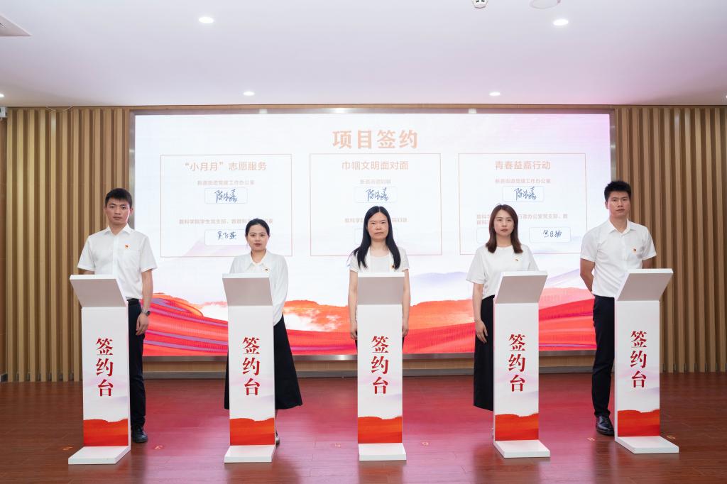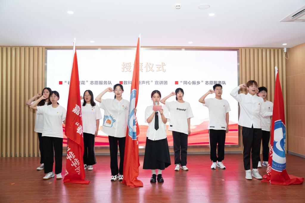 活动上,王玮、战昕分别介绍了院地发展现状和党建特色优势,紧紧围绕党建创新、志愿服务、社会治理等方面进行了总结,回顾了六年来院地党建联建合作的成果与经验,对下一阶段即将开启的合作进行了展望。随后院地双方签订了新一轮党建联建协议;同时为数科“新声代”宣讲团、“春苗夏花”志愿服务队、“同心振乡”志愿服务队授旗,三支志愿服务队代表进行了庄严宣誓;最后双方共同启动红七月·益嘉行暨а√中文在线资源库暑期社会实践活动。