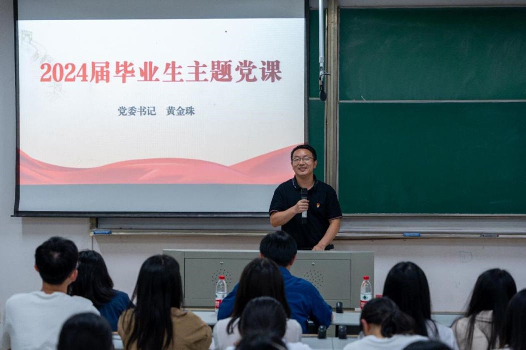 最后,黄金珠代表学院向即将开启新征程的毕业生党员献上毕业寄语。祝贺毕业生党员经过四年的奋力拼搏,顺利完成学业,向自己、向学校、向社会交出了一份满意的答卷,同时代表学院向同学们提出希望:一是永葆初心本色,奋进青春,建功新时代;二是牢记“方正为人、勤慎治学”的校训精神,努力学习,全面发展;三是坚守底线意识,永葆清廉本色。