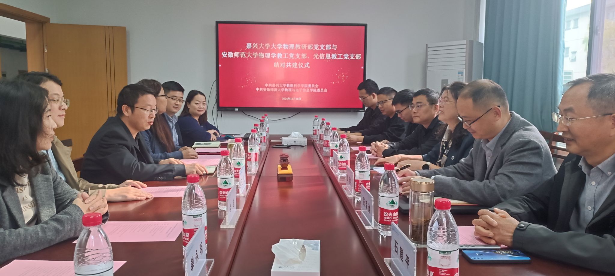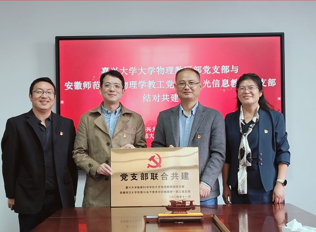 为深入推进新时代党支部建设工作,实现优势互补、互融互促,11月10日,嘉兴大学а√中文在线资源库大学物理教研部党支部与安徽师范大学物理与电子信息学院物理学(一,二)和光信息教工党支部开展结对共建活动。安徽师范大学物理与电子信息学院党委书记李娟一行与嘉兴大学а√中文在线资源库围绕党建、业务、课程思政建设等进行共建交流。