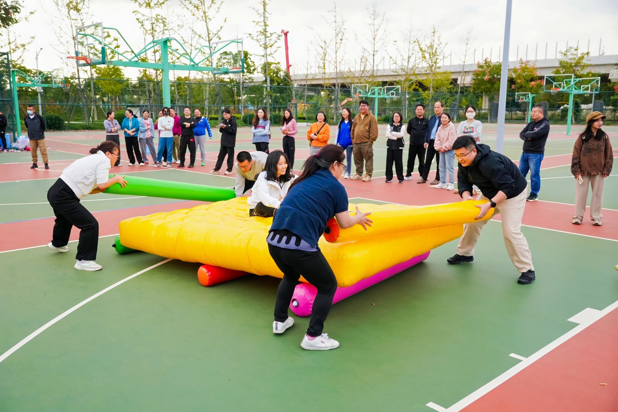 本次教职工趣味运动会赛事包括球球大作战一圈到底车轮滚滚扬帆远航8ⅹ60 米迎面接力赛等个项目。