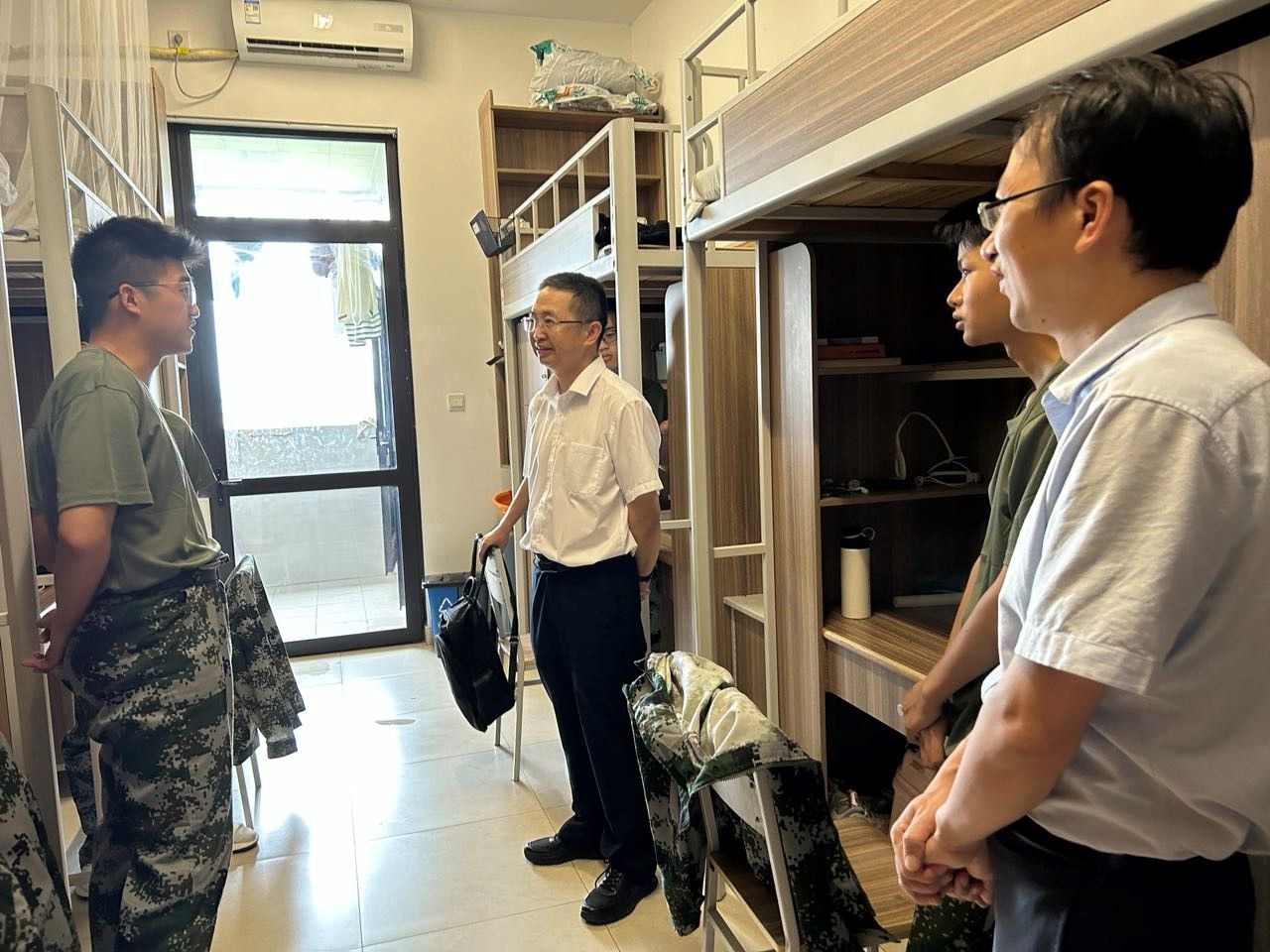 陈书记全面细致地了解新生的基本情况,详细询问了同学们生活情况,特别关注了新生们的军训情况,并耐心细致地解答学生们的问题。陈书记强调大学生活自主性的重要意义,鼓励同学们科学合理规划,不负青春,脚踏实地,找准努力方向。鼓励寝室成员之间相互关心、相互帮助,形成良好的寝室氛围。