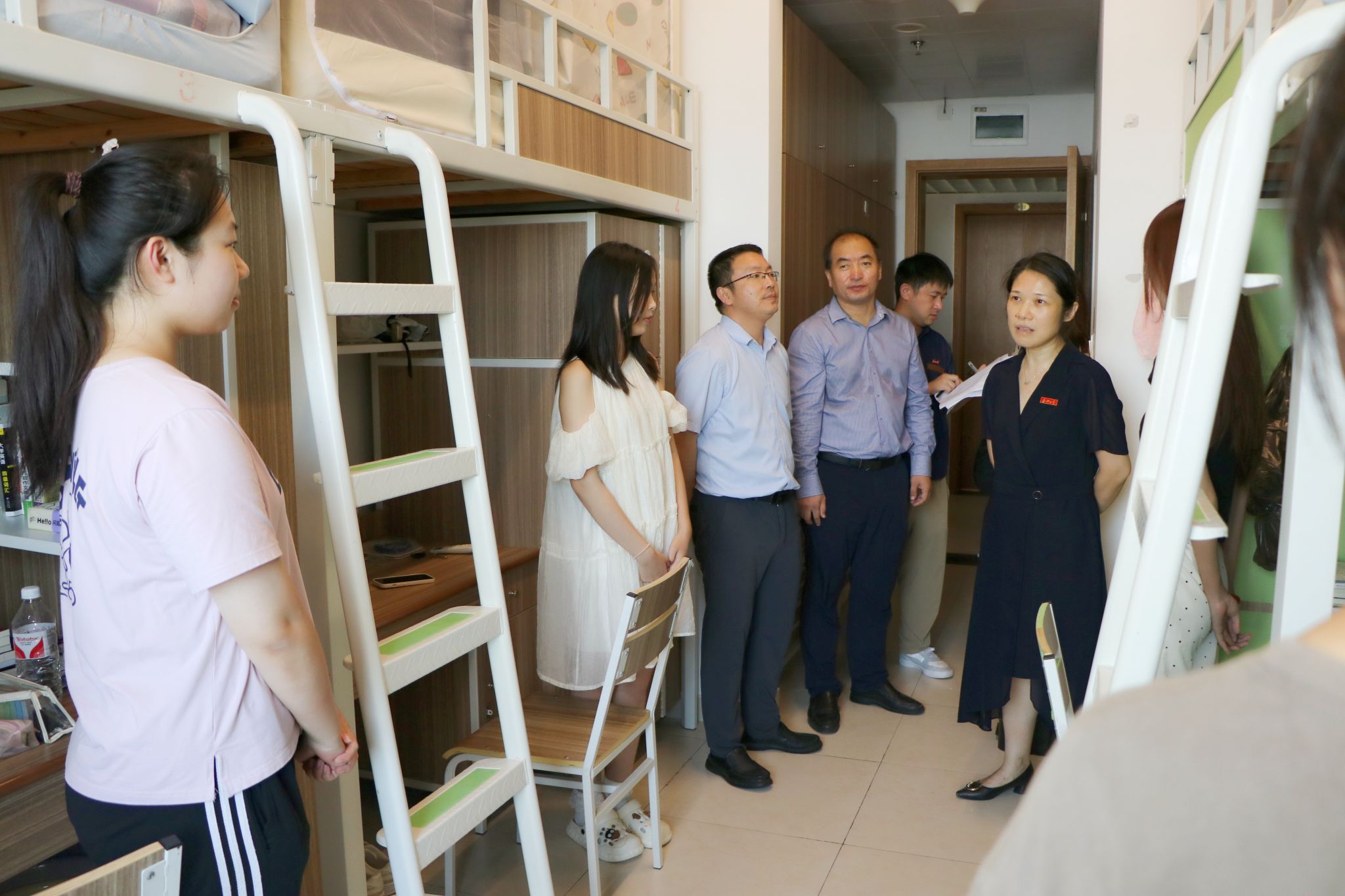 走访过程中,陈立力详细询问了新生们的入学适应情况以及生活习惯;她叮嘱同学们遇到困难或困惑时,要及时反馈,学校一定切实为同学们解决问题;同时,提醒同学们要规划好大学生活,共同维护一个健康、和谐的住宿环境。同学们也积极向领导们分享了自己在大学生活中的初体验,并表达了对大学生活的憧憬与向往。